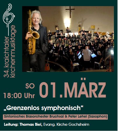 Am Sonntag, 1. März 2026 gastiert das Sinfonische Blasorchester Bruchsal, vormals "Stadtkapelle Bruchsal" unter der Leitung von Thomas Biel bei den diesjährigen 34. Kraichtaler Kirchenmusiktagen mit einem vielseitigen Programm mit Stücken von Alfred Reed und Johann Sebastian Bach. Ein besonderes Highlight wird der Auftritt des international gefeierten Jazz-Saxofonisten Peter Lehel sein, der zusammen mit dem Sinfonischen Blasorchester Bruchsal seine Eigenkomposition "Fantasy for Saxophone & Wind Orchestra" zum Besten gibt. Diese und weitere neue Arrangements hat das Sinfonische Blasorchester Bruchsal mit dem Dirigenten Thomas Biel für dieses außergewöhnliche Event einstudiert.